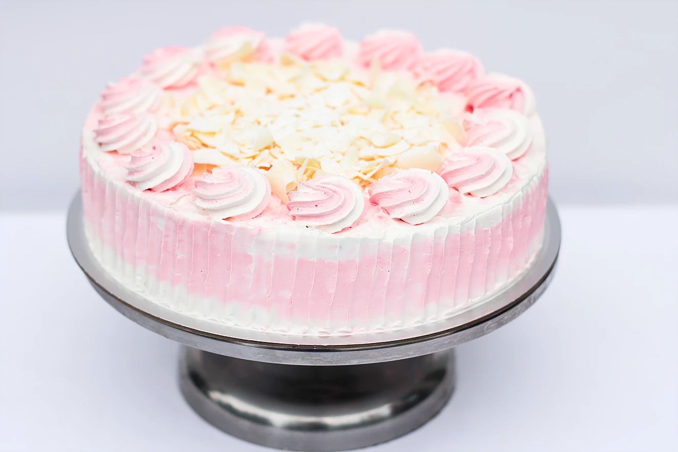 This raspberry angel cake is delicate, airy and soft, with raspberry filling sandwiched between vanilla sponges and covered with a raspberry ripple fresh cream and decorated with white chocolate shavings.